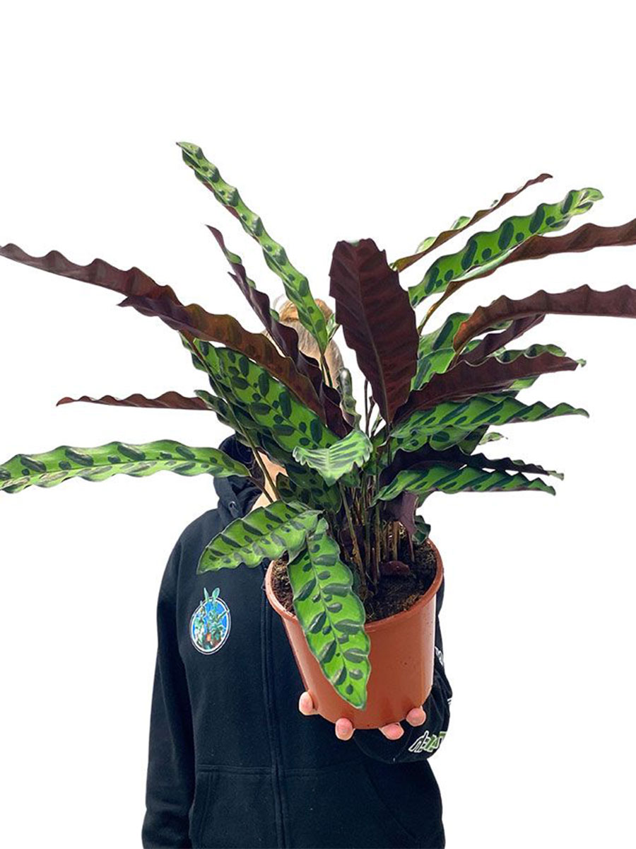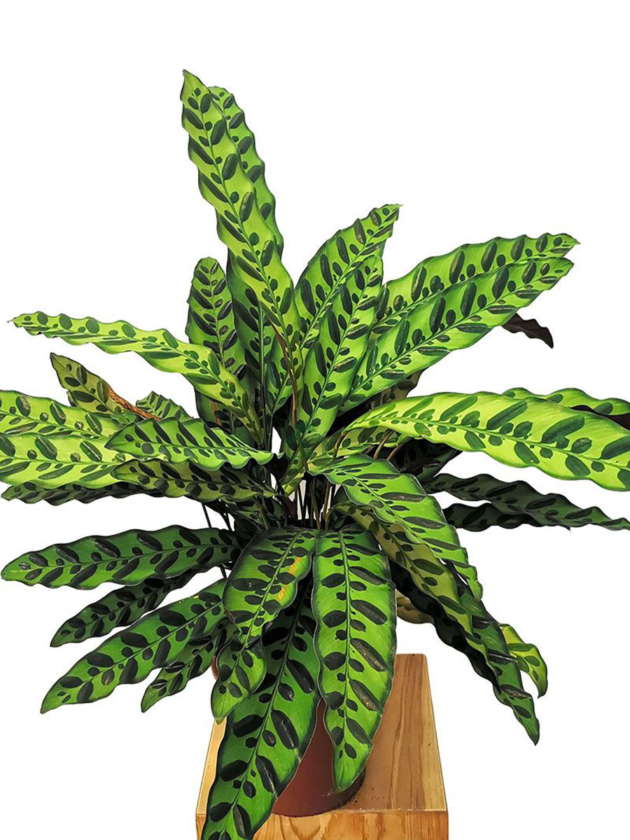 Die Calathea lancifolia ist eine dekorative Zimmerpflanze mit langen, schmalen Blättern, die dunkelgrün mit hellgrünen Streifen gefärbt sind und eine tropische Optik in jeden Raum bringen. Die Calathea lancifolia ist nicht giftig für Haustiere und Kinder und kann daher sicher aufgestellt werden. Mit ihrem buschigen, aufrechten Wuchs und den auffälligen Blättern ist die Calathea lancifolia ein attraktiver Blickfang in Wohn- und Arbeitsräumen. Die Calathea lancifolia ist pflegeleicht, wenn Licht, Wasser und Luftfeuchtigkeit optimal aufeinander abgestimmt werden, und eignet sich hervorragend als Solitärpflanze oder in Pflanzgruppen.